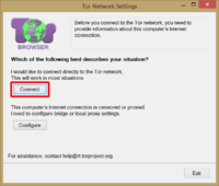 Внимание. Если вы заранее знаете, что ваш провайдер блокирует торовские соединения, не выполняйте описанные в этом шаге действия, а обратитесь к разделу Если Tor Browser должен быть настроен на работу с мостами во время первичной установки, после чего возвращайтесь сюда и продолжайте выполнять всё по инструкции, начиная со следующего шага. Напомню, что блокировка Рутрекера и блокировка Tor-а — разные вещи, и вам нужно иметь веские основания полагать, что провайдер блокирует Tor на вашем канале, чтобы настраивать для соединения с сетью Tor мосты, а не пытаться соединиться c ней напрямую.