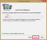 Шаг 5. Вы попадаете в окно Local Proxy Configuration. Оно предназначено для указания прокси, через который мы хотели бы соединяться с интернетом. Для большинства из нас прокси не требуется, мы напрямую подключаемся к своим провайдерам, так что нам тут делать нечего, отвечайте отрицательно «No» и жмите кнопку «Connect». Произойдёт попытка соединения с сетью Tor через только что настроенные нами мосты.