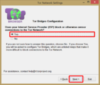 Шаг 2. Мы в окне Tor Network Settings, настройки параметров соединения с сетью Tor. Нам задают вопрос, блокирует ли или цензурирует наш провайдер связь с интернетом? Конечно да, иначе нас бы тут не было. Отвечаем утвердительно — «Yes» — и жмём кнопку «Next».
