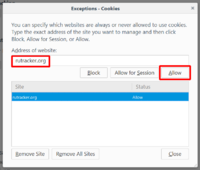 Шаг 22. Вводим здесь исключение: мы будем принимать куки только от домена rutracker.org. Вводите это в текстовое поле и нажимайте кнопку «Allow». Домен появился в списке ниже — теперь приём кук запрещён для всех сайтов, кроме Рутрекера — для него разрешаем их приём. Выходите из этого окна и из настроек Firefox.